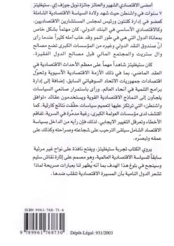 يروي الكتاب تجربة ستيغليتز و يفتح نافدة على نواح غير مرئية سابقا للسياسة الاقتصادية العالمية و هو مصمم على إثارة نقاش سليم و سينجح في بلوغ هذا الهدف بما أنه المسيرة الاقتصادية تتقلب ضدها.